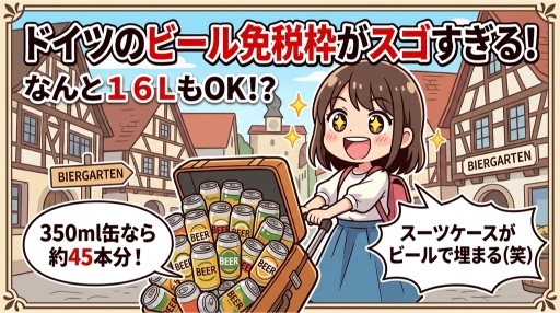 ビール16Lは350ml缶で約45本分。正直、日本からビールをこれだけ持ち込む人はいないと思うけど、「ドイツはビールに関しては寛容な国」っていう象徴的な数字だよね。現地のビールが安くて美味いから、持ち込むよりドイツで飲むほうが楽しい。